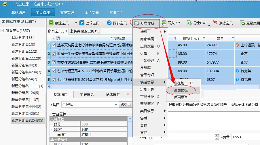 解决方法:在淘宝后台先设置好运费模板之后,在淘宝助理里面给所有的宝贝批量选择对应的模板。您可以进入“卖家中心”—“物流管理”—“物流工具”—“运费模板”中直接操作设置运费模板,点击这里查看使用帮助。淘宝运费模板介绍