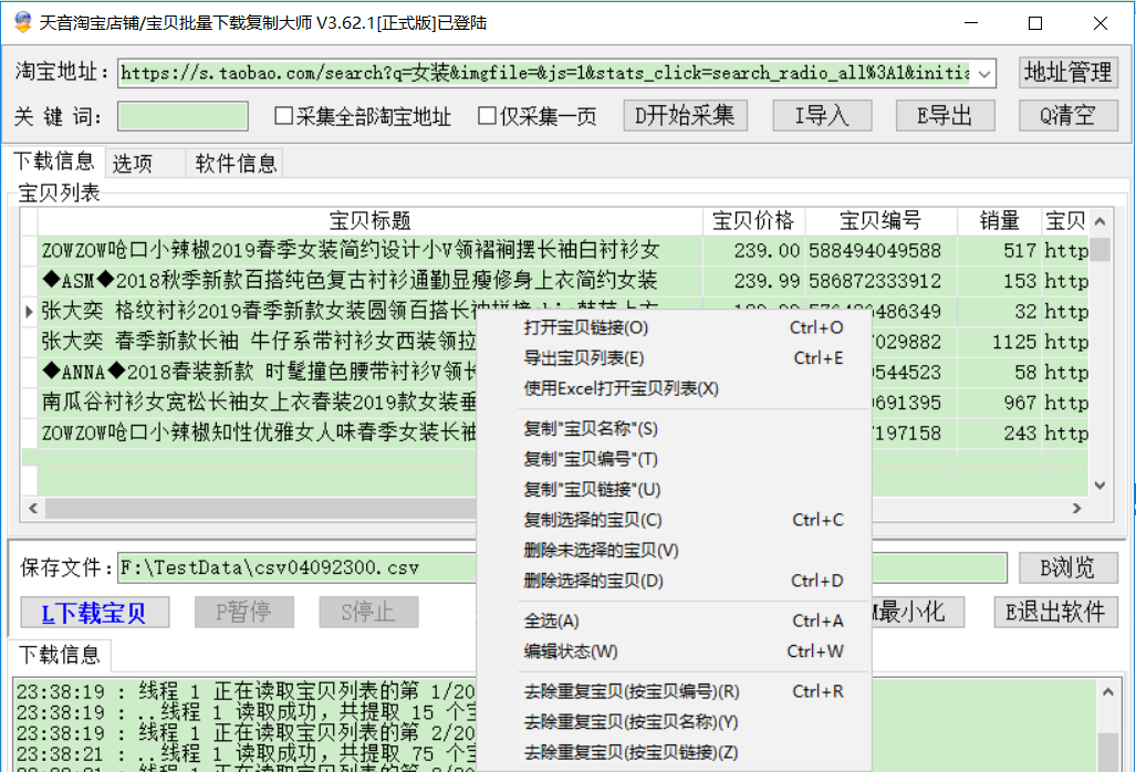 可以根据宝贝名称(链接)删除重复宝贝,如果使用该功能,一般的操作步骤是:下载列表—>去除重复宝贝—>下载宝贝。