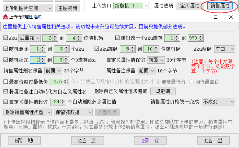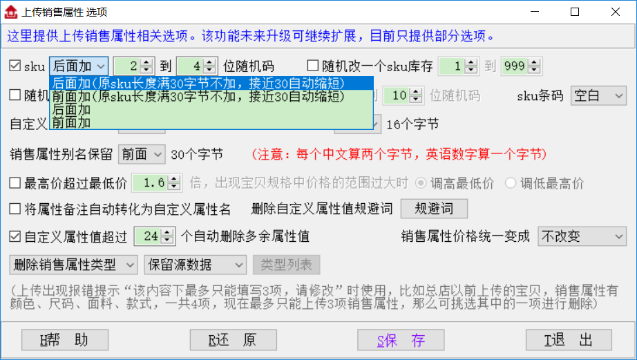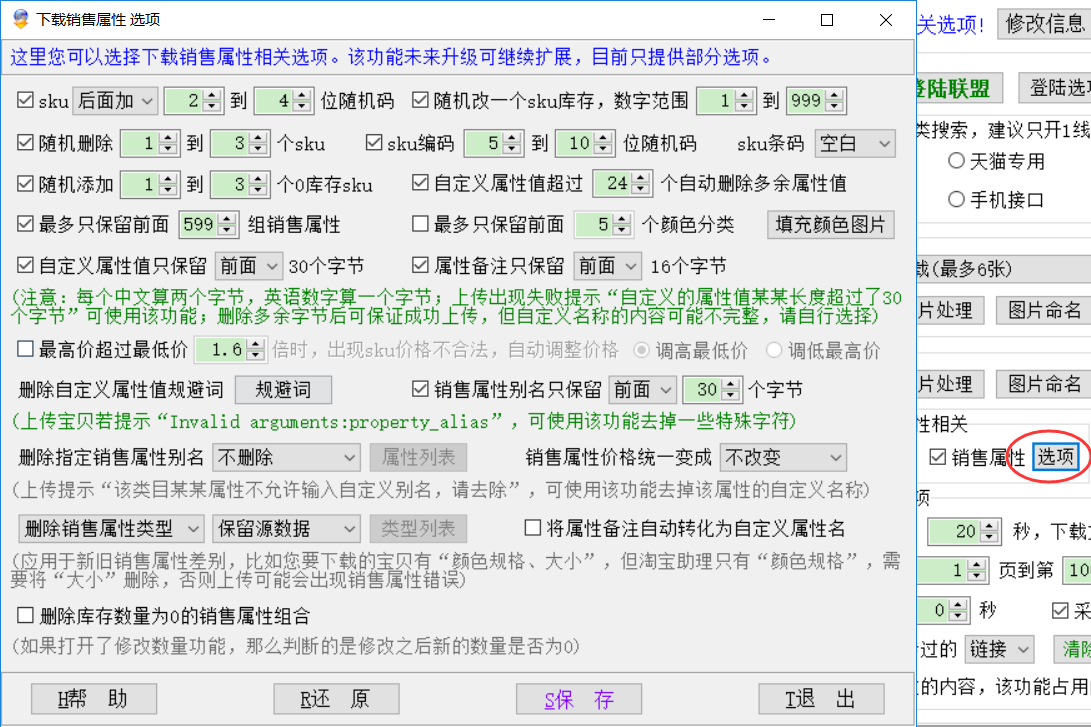 ▲销售属性别名只保留前面(后面)N个字节:淘宝规定,销售属性别名不能超过60个字节,也就是30个汉字,天音会自动截断;有些客户有特殊要求,希望把销售属性别名再缩短一些,可以使用这个功能,比如只保留前面16个字节,默认不选;