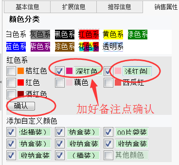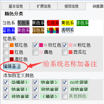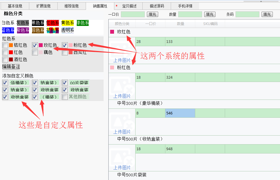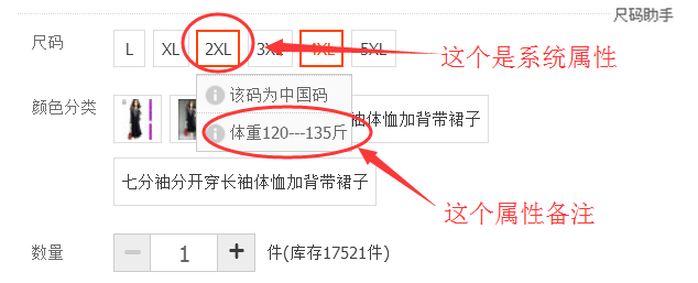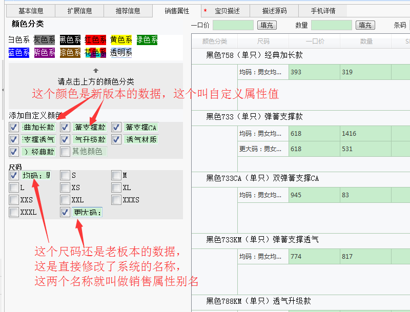 自定义属性、属性备注 这两个名称是新版本的颜色尺码才有的,详细看下面的截图