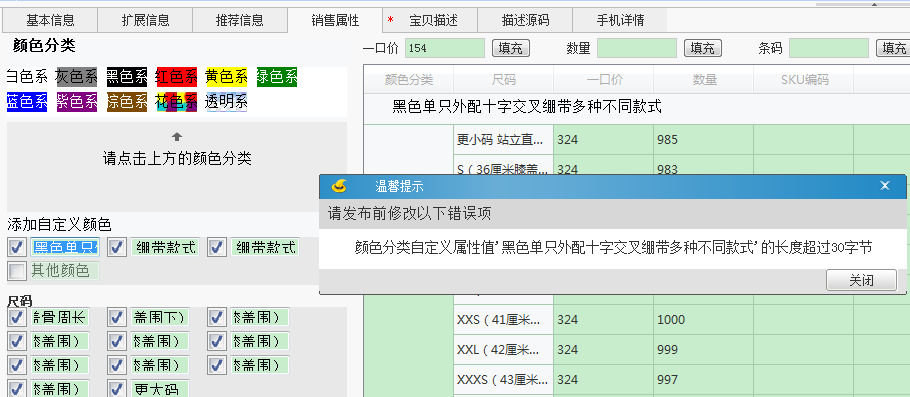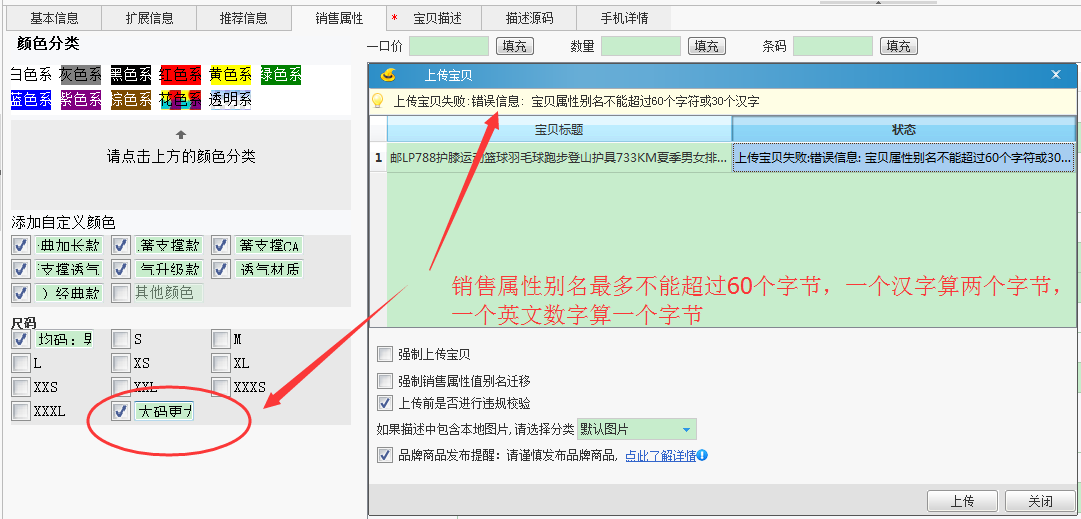 淘宝规定,销售属性别名不能超过60个字节,也就是30个汉字,超过部分天音会自动截断;