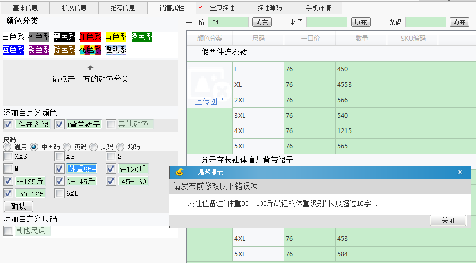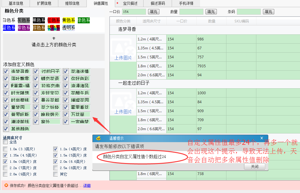 这种错误只要把“自定义属性值超过24个自动删除多余属性值”勾选上就可以了