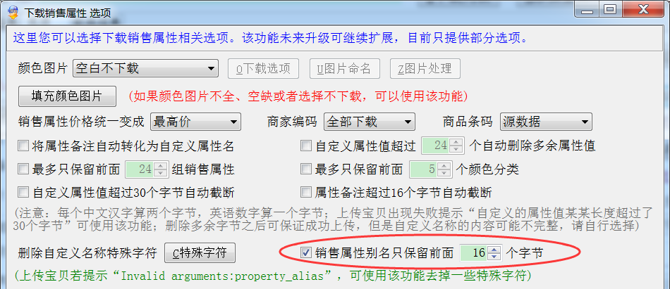 ▲自定义属性值只保留前面(后面)30个字节:淘宝规定,自定义属性值不能超过30个字节,也就是15个汉字,默认勾选;