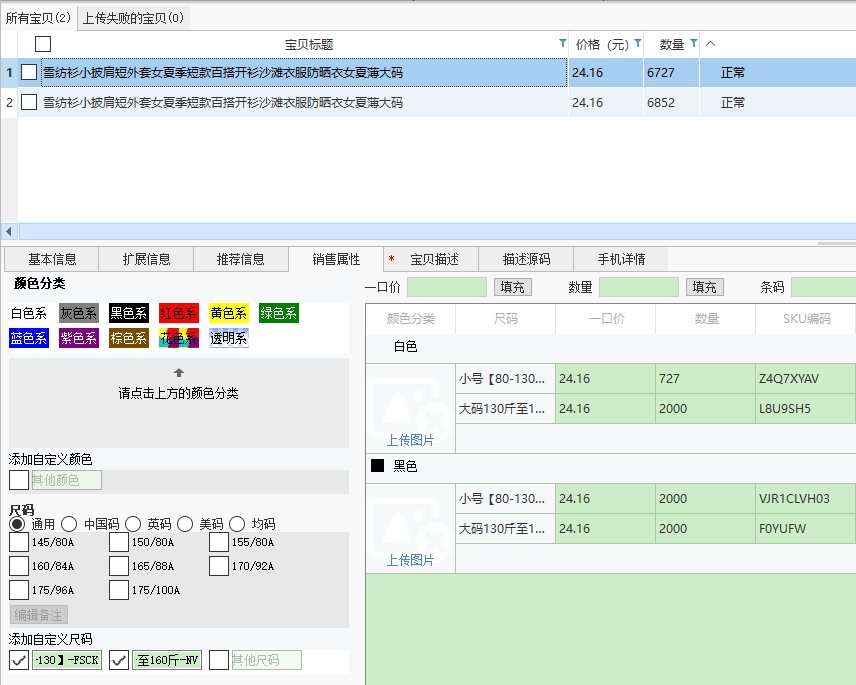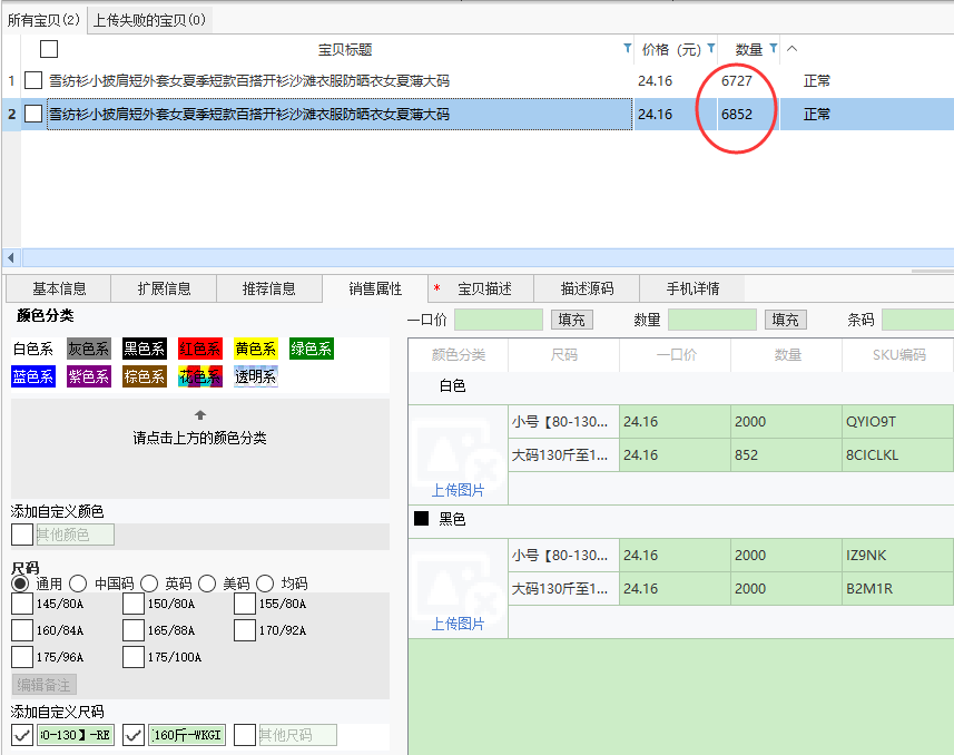 只有一部分销售属性组合数量为0对上传宝贝没有影响,但是不能全部都为0,相当于没有库存,无法上传。