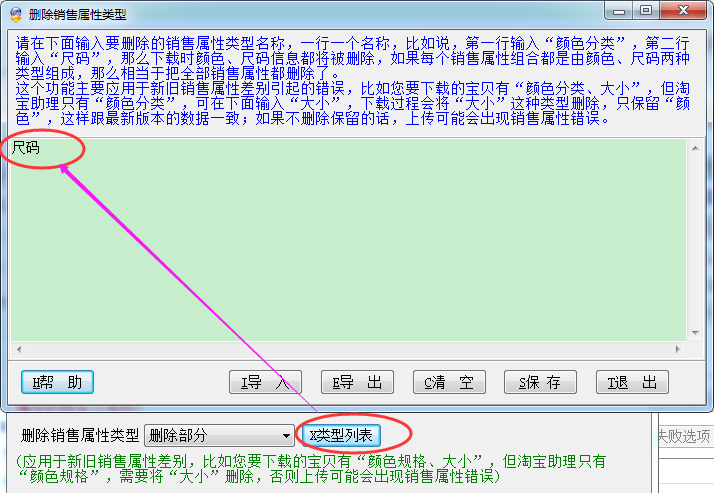 请在下面输入要删除的销售属性类型名称,一行一个名称,比如说,第一行输入“颜色分类”,第二行输入“尺码”,那么下载时颜色、尺码信息都将被删除,如果每个销售属性组合都是由颜色、尺码两种类型组成,那么相当于把全部销售属性都删除了。