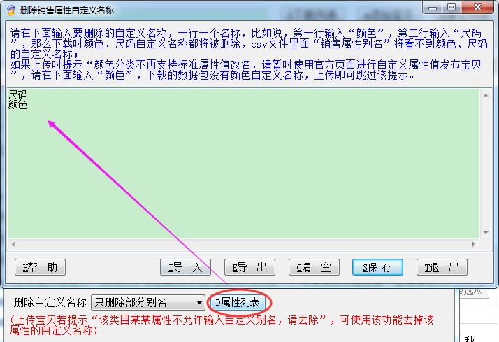 请在下面输入要删除的自定义名称,一行一个名称,比如说,第一行输入“颜色”,第二行输入“尺码”,那么下载时颜色、尺码自定义名称都将被删除,csv文件里面“销售属性别名”将看不到颜色、尺码的自定义名称;