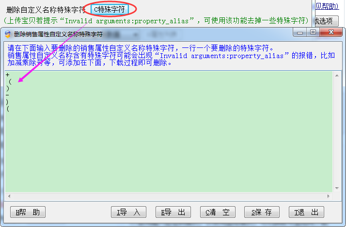 销售属性自定义名称含有特殊字符可能会出现“Invalid arguments:property_alias”的报错,比如加减乘除号等,可添加在下面,下载过程即可删除。