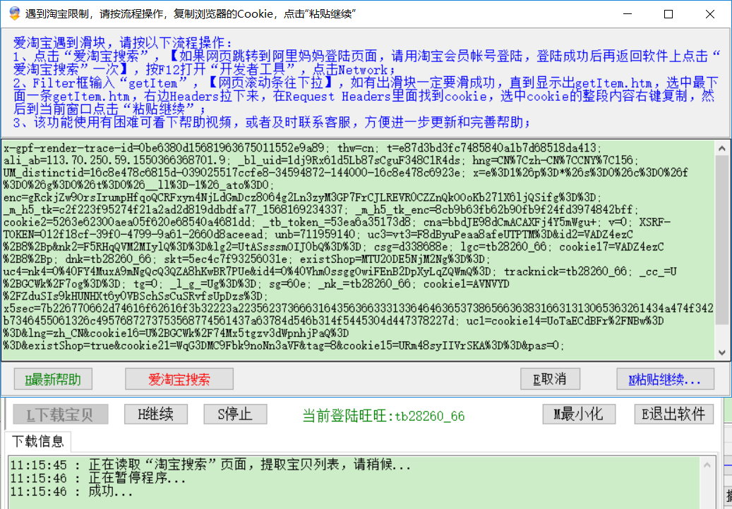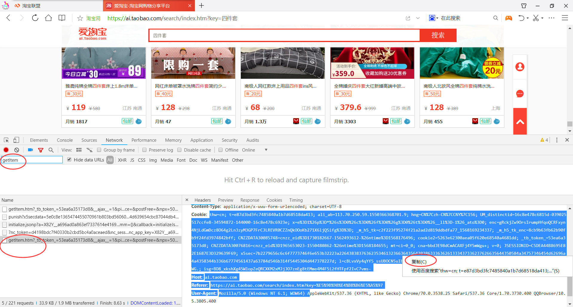 —>第二步:Filter框输入“getItem”,【网页滚动条往下拉】,如有出滑块一定要滑成功,直到显示出getItem.htm,选中最下面一条getItem.htm,右边Headers拉下来,在Request Headers里面找到cookie,选中cookie的整段内容右键复制,然后到当前窗口点击“粘贴继续”;