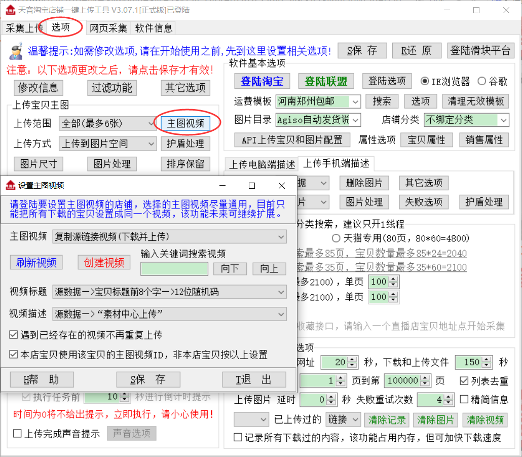 ▼主图视频设置在软件的左上方,需要登陆上传宝贝的店铺