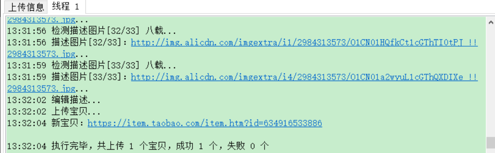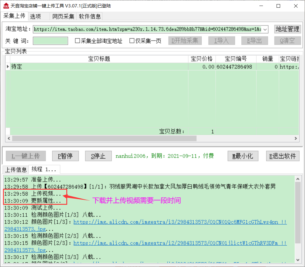 ▼点击“一键上传”把宝贝上传到出售中,下载并上传视频需要一段时间