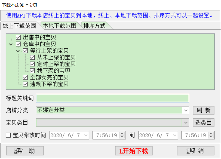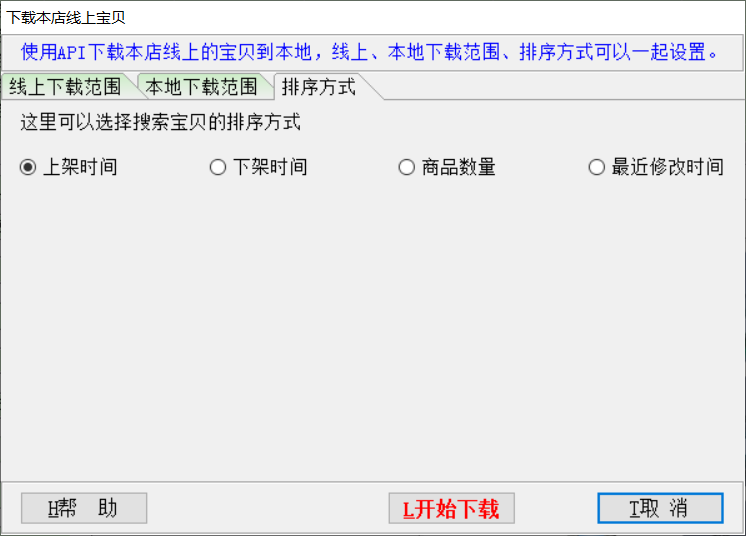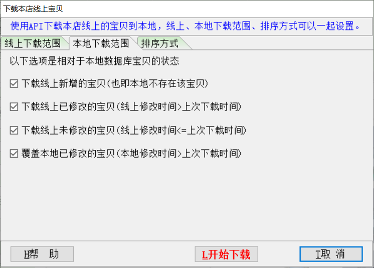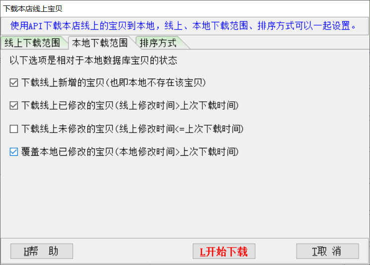 ▼使用API下载本店线上的宝贝到本地,线上、本地下载范围、排序方式可以一起设置。