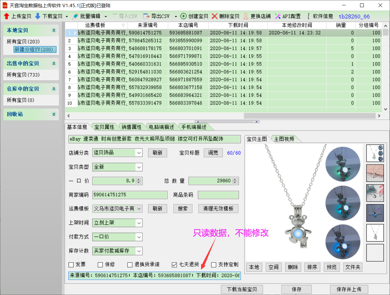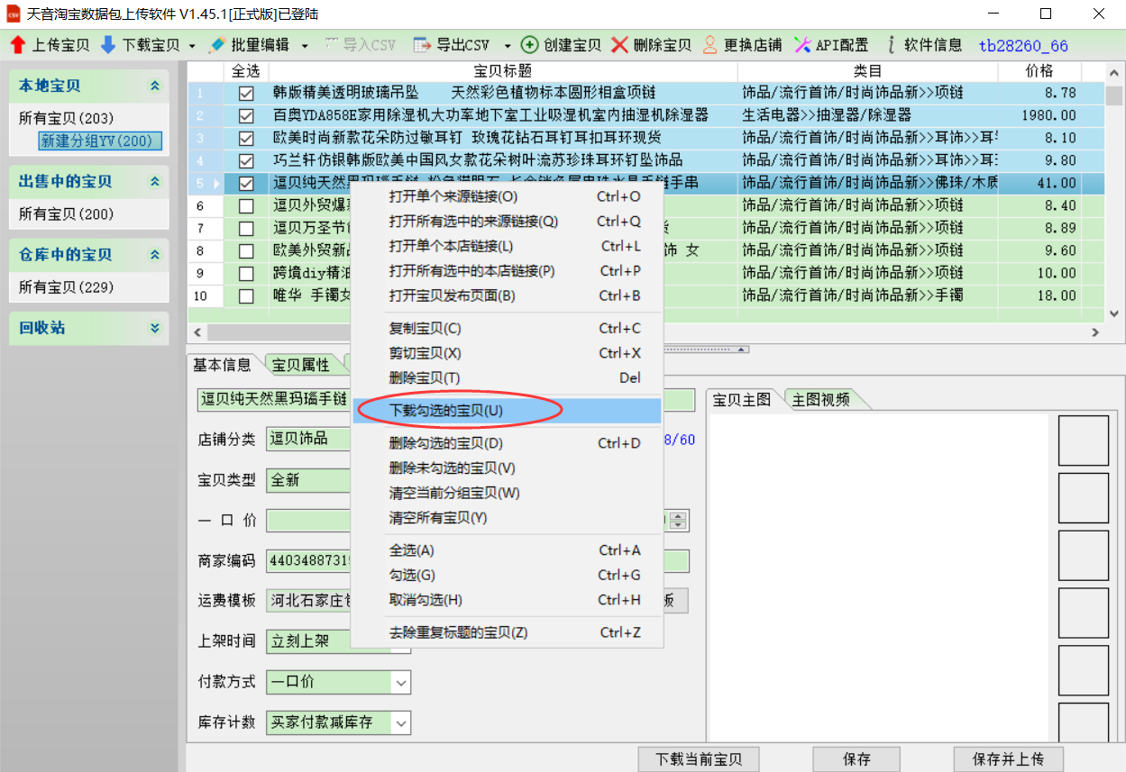 天音淘宝数据包上传软件—>下载本店线上宝贝