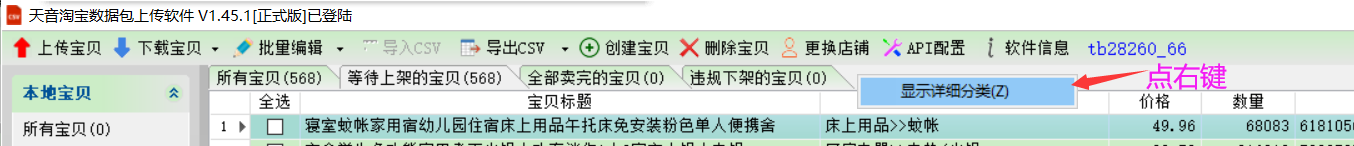 ▼软件默认只显示四个分类,在分类框右侧右键点击可显示【等待上架的宝贝】里面三个子分类。