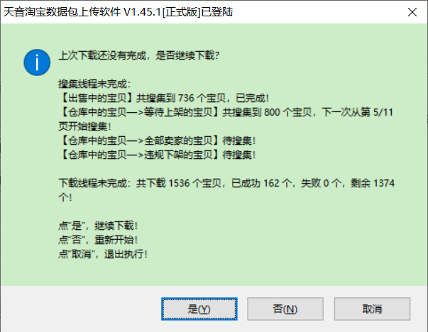 ▼上次下载未完成,下次再进入下载本店宝贝的所有功能,都会弹出下面的提示,列出上次下载的详细情况,可选择继续下载,也可以重新开始。