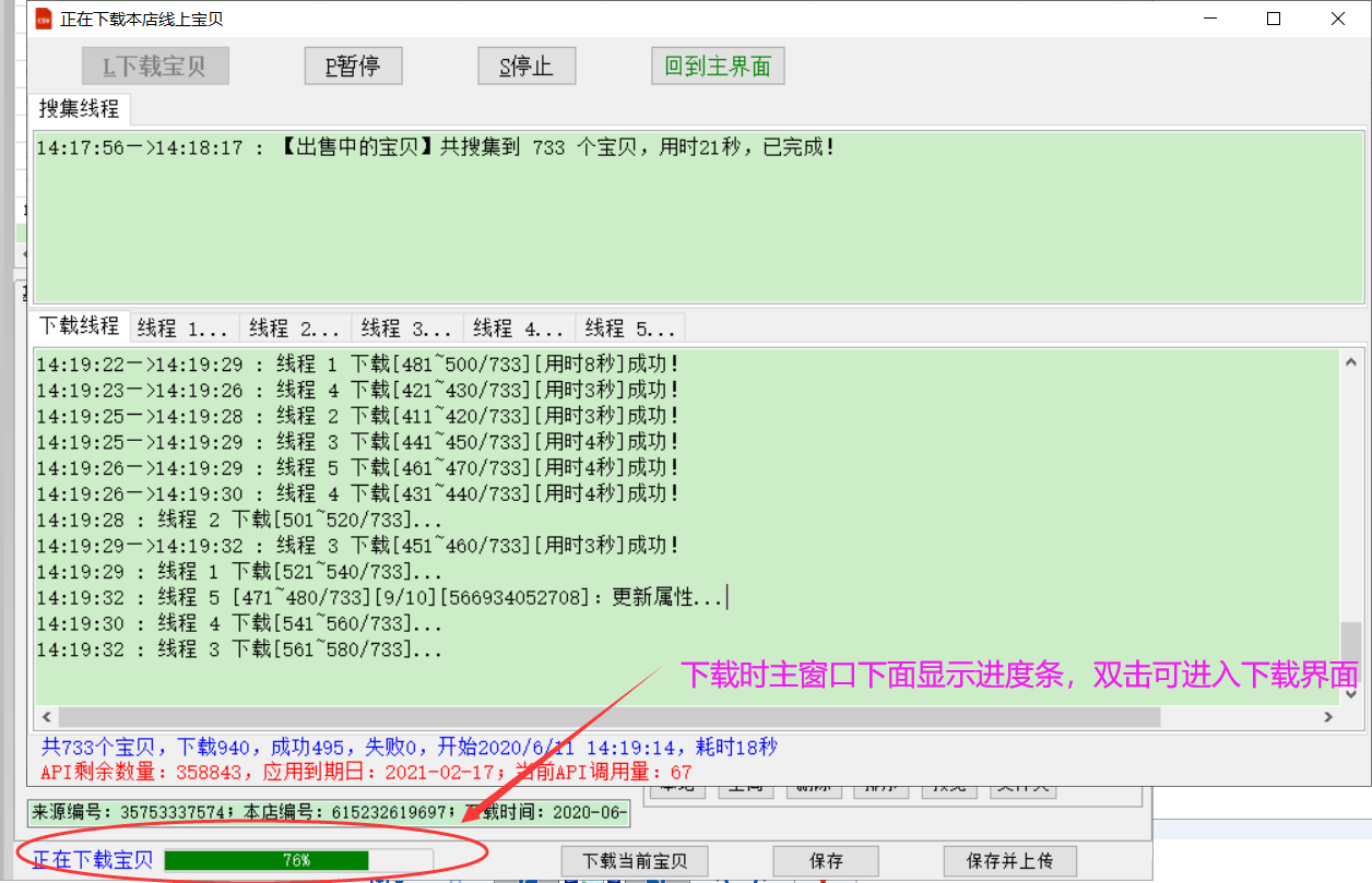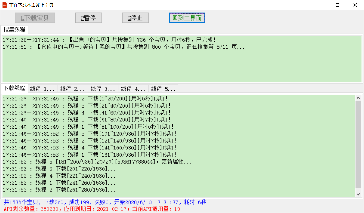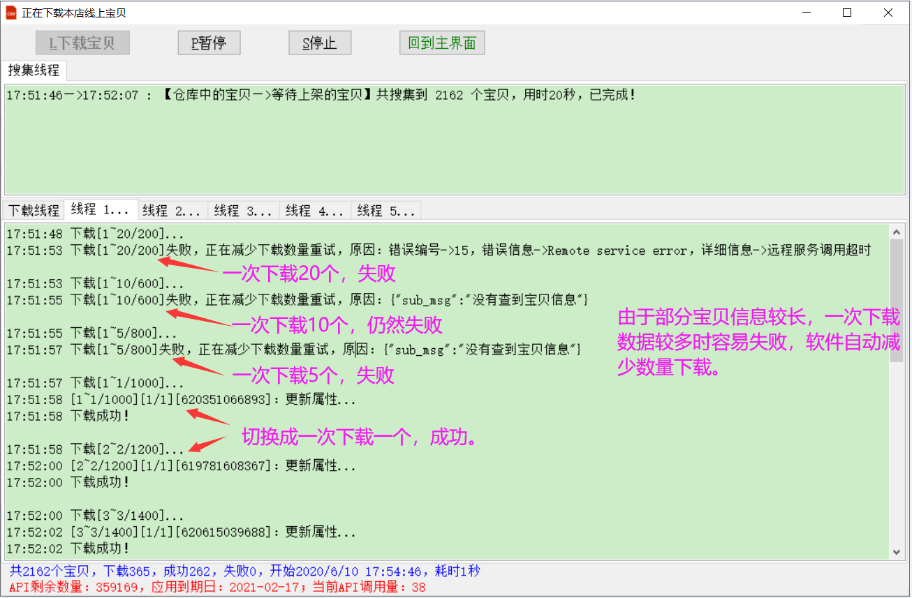 下载线程 最多5线程,api调用一次,最多下载20个宝贝详细信息;由于部分宝贝信息(描述等)较长,一次下载数量过多容易失败;如果失败,会切换成一次下载10个、5个、1个,直到成功为止。