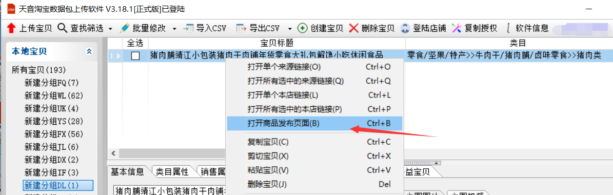 ▼数据包上传软件,在宝贝上面点右键—>打开商品发布页面