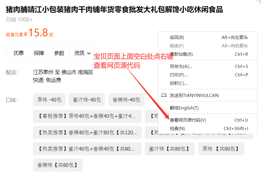 在宝贝页面上面空白处点右键,查看网页源代码—>