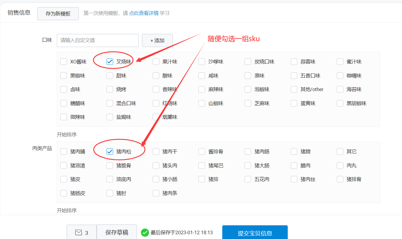 2、商品发布宝贝往下拉,找到销售信息,随便勾选一组SKU