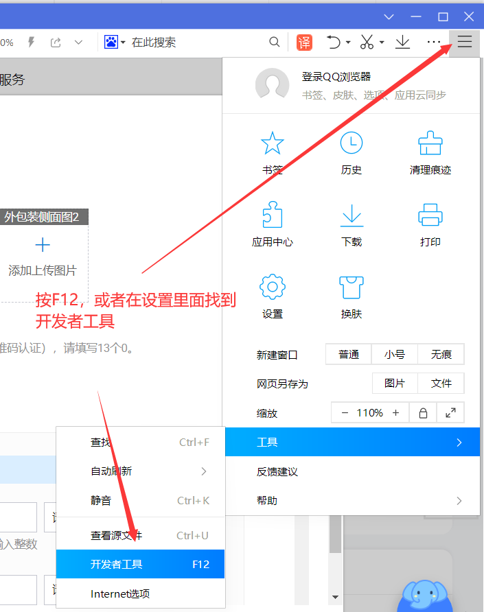 5、打开开发者工具,可点F12,或者在设置里面找到开发者工具