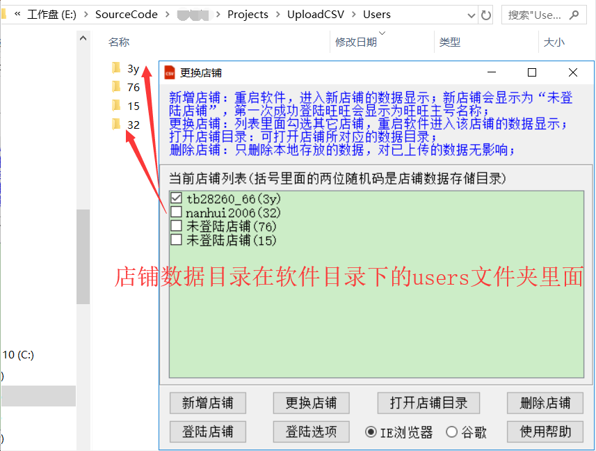 ▼软件将每个店铺的数据分开存放,点击更换店铺,选择对应店铺,点击打开店铺目录,可进入相应数据目录