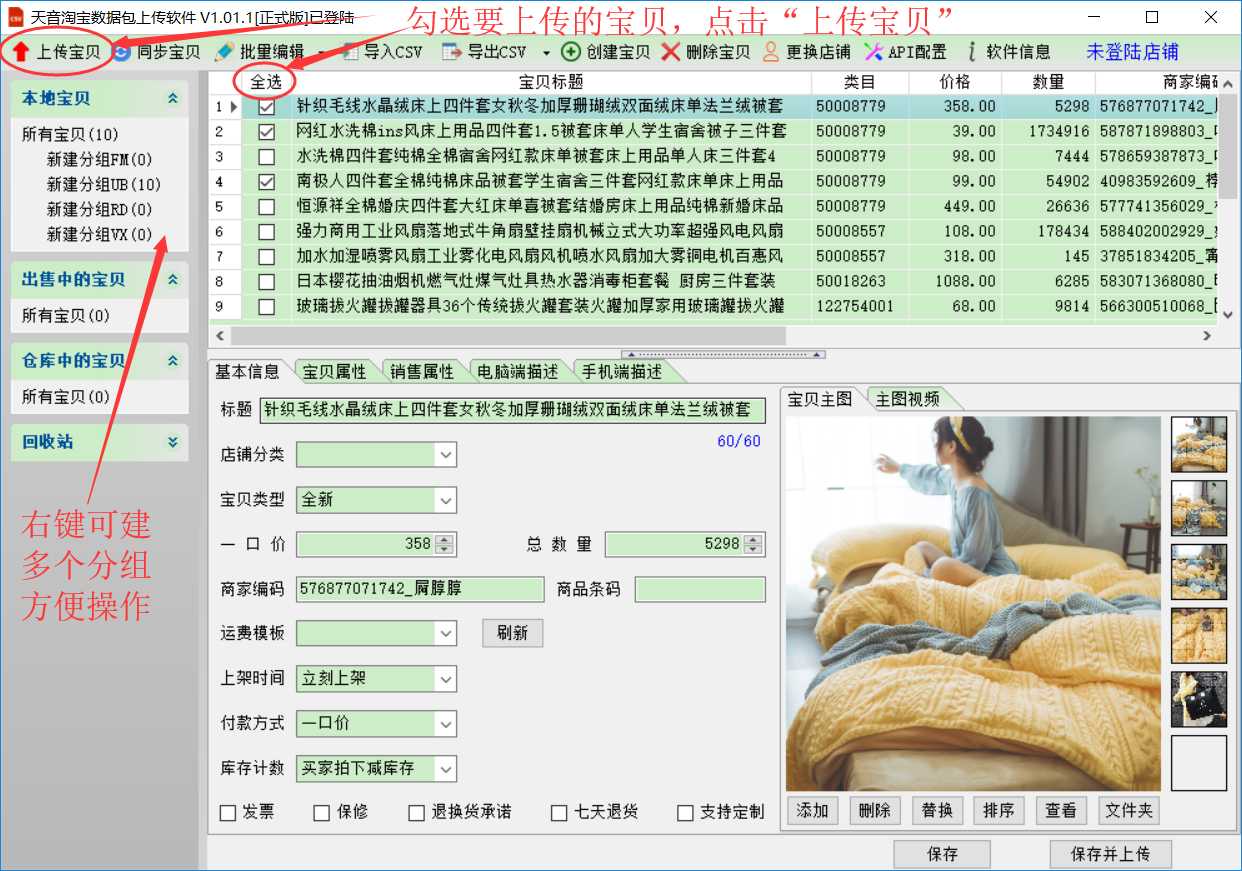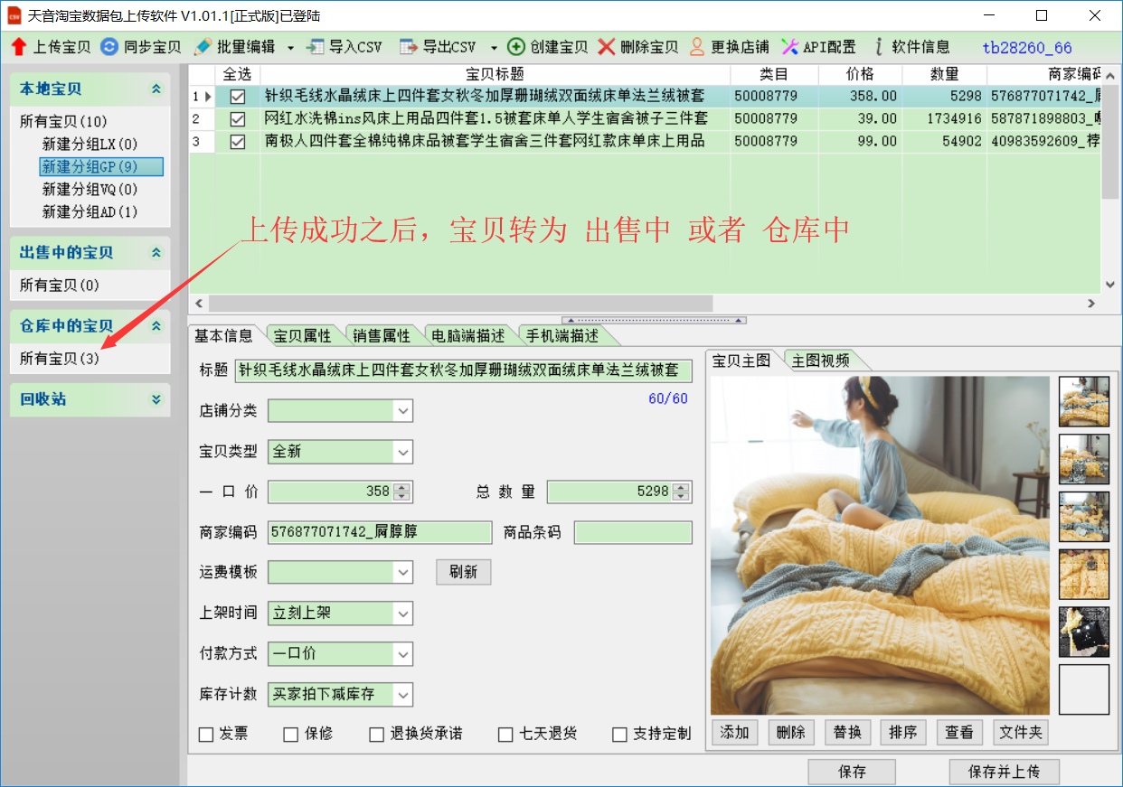 —>上传成功之后,宝贝转为 出售中 或者 仓库中