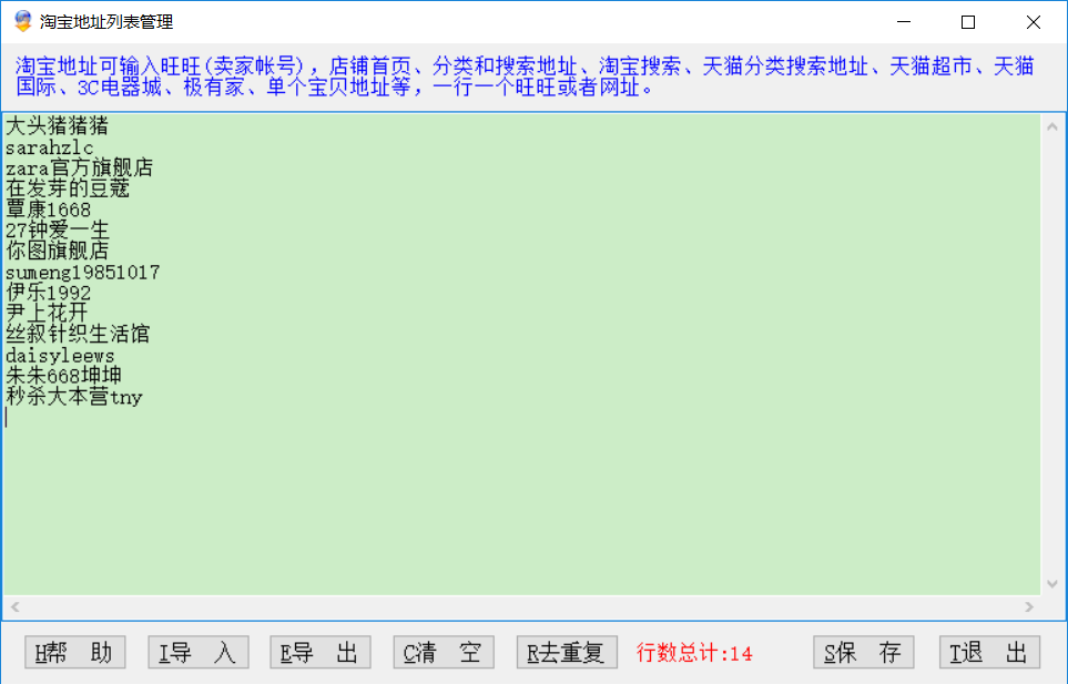 比如下图,只要输入多个旺旺,勾选“下载全部淘宝地址”,点击“下载列表”,软件即会轮流下载所有店铺的数据。