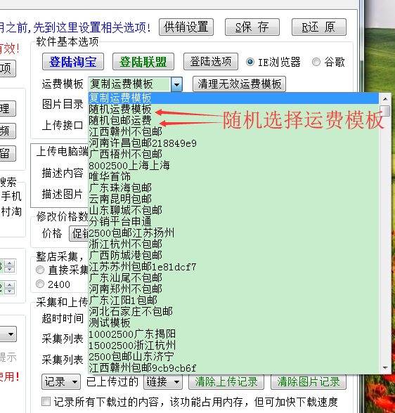 上传类目软件运费模板可随机选择,包括选择随机包邮运费;