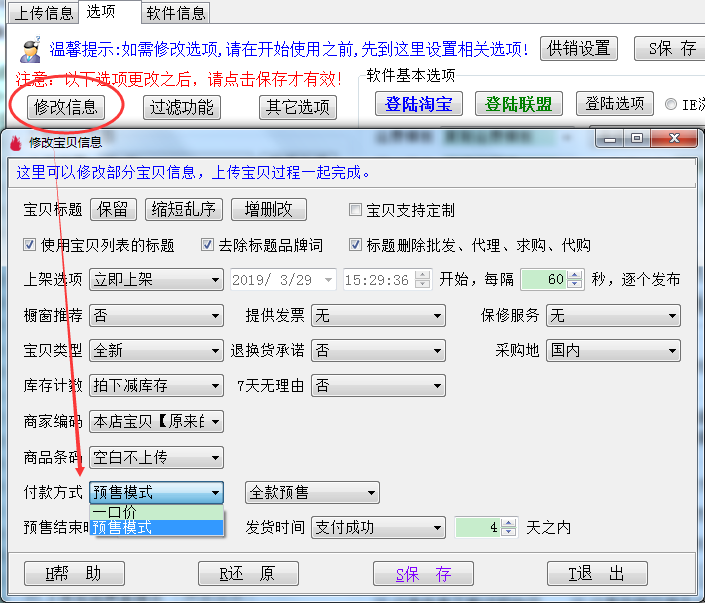 上传类软件修改信息加入预售相关选项;