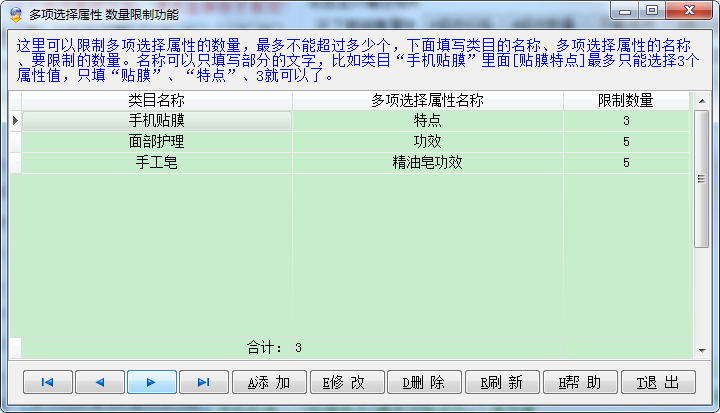 此为2.97.13新增加功能,这个功能可以提高上传成功率,避免上传时出现类似于下面的错误:"手机贴膜—>[贴膜特点]最多只能选择3个属性值;面部护理套装—>[功效]最多只能选择5个属性值",只要限制相应类目多项选择属性的数量即可。